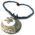 シェルビーズネックレスの中でもこちらのピュアビーズネックレス ムーン ブラックはビーズの発色がとってもキレイな一品です。ヘッド部分のムーン型シェルにはプルメリアのデザインが手彫りされていて、先端にゆれるシェルを際立たせています。