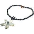 開店以来の人気アクセサリー、ハワイアンシェルビーズネックレスにプルメリアのシンプルなブラックが登場。天然の貝の色味が、美しく黒光りするビーズによく映えていますね。フラやタヒチアンの衣装にはもちろんワンピや普段着にあわせると、1ワンク上のドレスアップ感が演出できます。