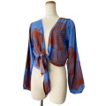 冷房対策にも日焼け対策にもドレスの羽織りものとして大活躍♪ ハワイアンワンピやドレスの羽織りものにピッタリで肩やデコルテをだすスタイルの多いシチュエーションに嬉しい、しかも2通りの着方を楽しめる2wayカシュクールボレロ シェードリーフブルーが完成しました♪ 素肌にとっても心地よいレーヨン100%の素材は肌が透けない生地感で、着丈は42cmのハイウエスト。脚長効果がバツグンで、とっても綺麗な体型に魅せてくれます。 袖丈は58cmあって、袖口がゴムのシャーリングになっていてとってもフェミニンなフォルム。 これだと袖のもたつきもないし、ふんわりとしたシルエットに仕上がってとっても素敵なんです♪ 身幅は50cmですが、ごらんのとおり紐でお好みの結び方で調節できますので、かなり幅広いサイズや体型の方にお召しいただけます。 着方は2way以上に楽しめます。 1way:前身頃でヒモをちょうちょ結びしてフェミニンな仕上がりに。 2way:ヒモをあえて結ばず、下に垂らしてかっこいいアクセントに。 3way:ヒモをぐるりと後ろで結んでスタイリッシュ&フォーマルな印象の仕上がりに。 着る人の体型を選ばず、それなのに脚長にみせてシルエットをしっかりカバーしてくれる、と大好評なんですよ♪ また、シワにならない素材で肌ざわりも心地いい素材。衣装やドレス、ワピースはもちろんTシャツやパンツスタイルにもあわせられる万能な1枚です。 そして冷房対策にも、日焼け対策にも、体型隠し対策にもなってくれるのがなんと言っても嬉しいポイント♪ ドレスの羽織りものとしてはもちろん、Tシャツ&ジーンズなどお手持ちのボトムスとコーデしてもOKなデザインですので、大活躍してくれること間違いナシ! シワにならないので、衣装としてはもちろんリゾートや旅行のお供にも最適な1枚ですよ♪ 【お客様へ】 ※こちらの商品は総柄の生地をカットして縫製しております。裁断位置によって、柄の見え方は1つ1つ変わりますので、どうぞご了承の上お買い求め頂きますようお願い致します。(返品理由の対象外となります) ※海外生産ですので、多少の糸つれ・糸ひきは生地の性質上やむを得ません。 どうぞご了承の上お買い求め頂きますようお願い致します。 ※シワになりにくい素材ですが、万一しわがついた際はご家庭にてアイロンしていただくと、すぐにきれいなラインが蘇ります(温度は中程度)。 エアブラシ加工のものはアイロンの滑りが悪い場合がございますので、その場合は生地を裏返して、アイロンしていただくと多少滑りがよくなります。