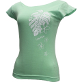 全国のフラダンサーだけでなく、ハワイアンファンの方々、ジムに通う方等々から待望のお声をいただいていたカットオフストレッチTシャツ、モンステラ&プルメリアの、新色シャーベットグリーンがララフラから新発売です♪このTシャツの人気のヒミツは、その着心地。カラダにフィットしてボディラインを美しく見せてくれる上に、踊りやすさを最優先した作りにいたしました。襟ぐり大きめ、袖丈みじかめで、エレガントで洗練された印象に仕上がっています。背中にもプリントがあって、ターンの時にもセンスが漂いますよ!